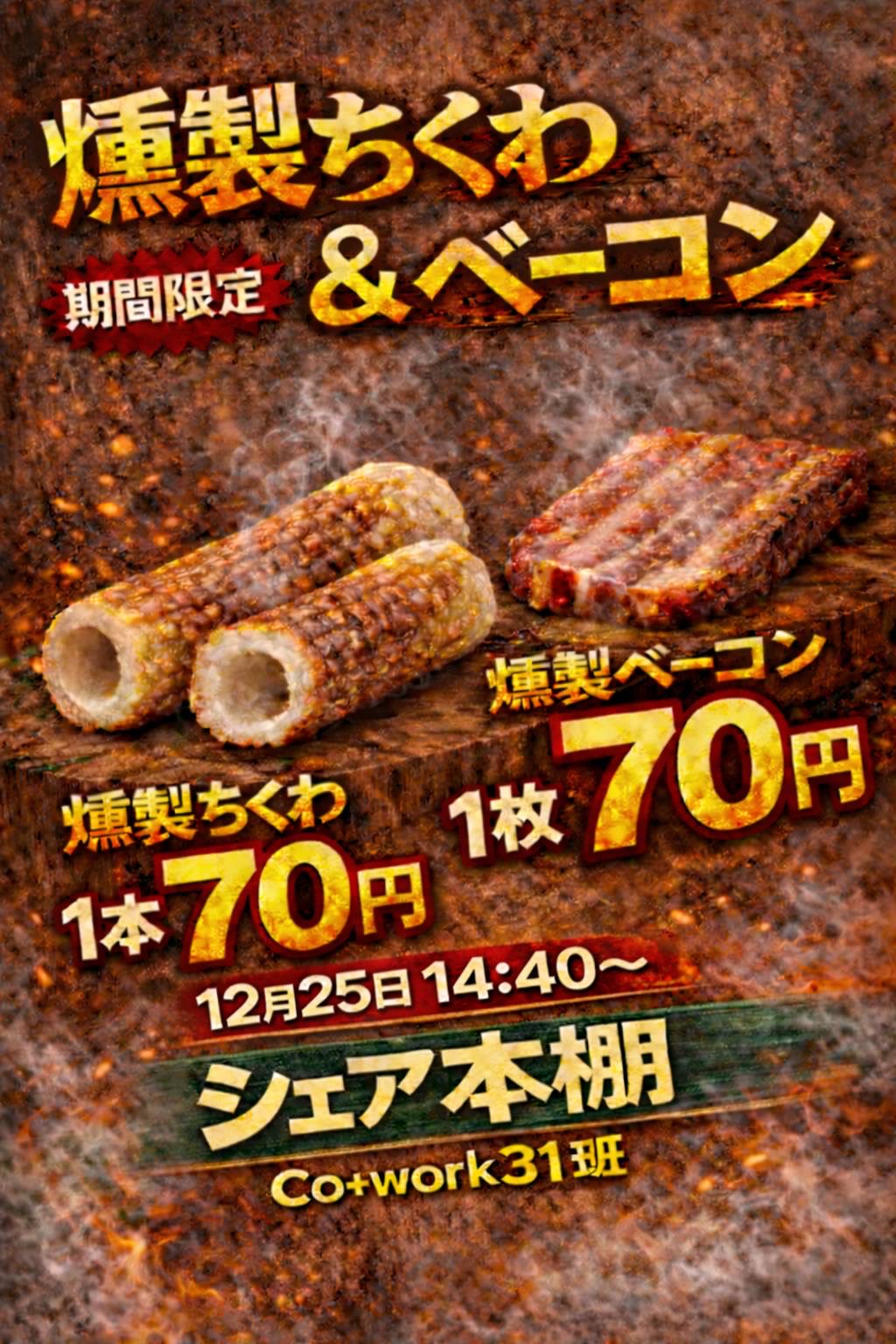 明石高専とのコラボ企画で、明石高専生が制作した燻製機で作った燻製ちくわと燻製ベーコンを販売します。今日の14:40頃から販売で、今日のみの企画です。よろしくお願い致します。