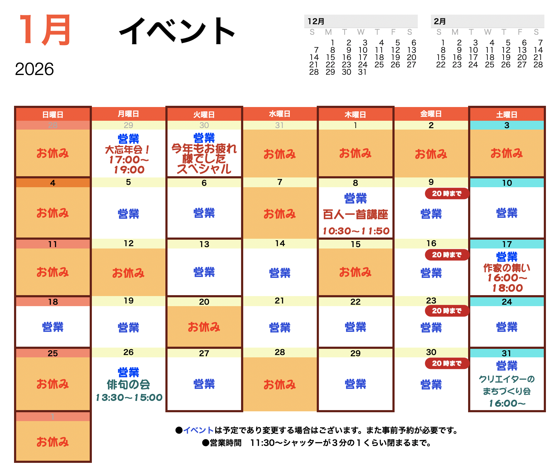 あけましておめでとうございます。 本年もどうぞよろしくお願い致します。 1月のスケジュールです。 新年は5日からの営業となります。